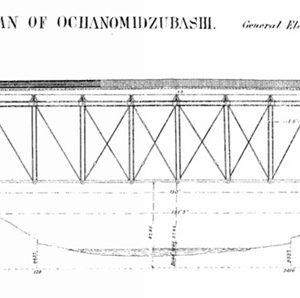 御茶ノ水駅の西口で神田川と中央本線を跨いでいる道路橋のお茶の水橋は、1891(明治24)年に初代の橋梁が架設された。設計は1881(明治14)年に東京大学理学部を卒業して東京府技師となった原龍太(1854~1912)で、支間45.7m、主構中心間隔6.1m、主構中心高さ7.6mという緒元の、ピン結合による上路プラットトラスを主径間とし、前後の側径間に支間11.0mの上路プレートガーダを用いて完成した。