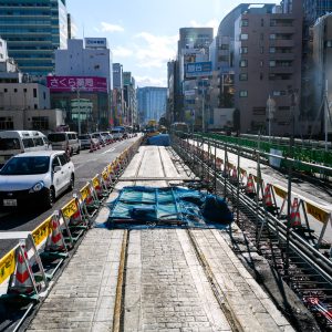 お茶の水橋を渡る都電は1944(昭和19)年に廃止されたが、2019(令和元)年に舗装工事を行なったところ軌道敷とレールが発見されて話題となった。(小野田滋)(「日本鉄道施設協会誌」2024年8月号掲載)