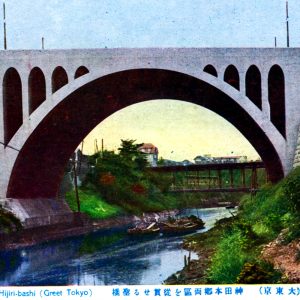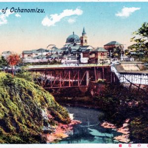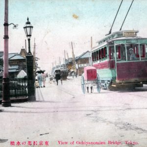 「(東京名所)御茶の水橋」と題した絵葉書にはこの初代のお茶の水橋の上を路面電車が渡り、その後方には東京女子高等師範学校の校舎が建つ。東京女子高等師範学校は現在のお茶の水女子大学の前身で、1932(昭和7)年に茗荷谷へ移転して現在は東京科学大学湯島キャンパス(医学部、歯学部)の敷地となっている。甲武鉄道は1906(明治39)年に国有化され、東京電気鉄道も同年に東京鉄道となったのち1911(明治44)年に東京市に買収された。