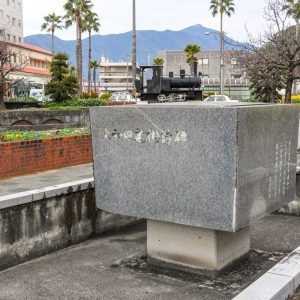 「宇和島城築城400年祭」と「大和田建樹生誕100周年」を記念して、宇和島鉄道1号機関車とともに2000(平成12)年に設置された。詩碑の設計は、建築家の清家清(せいけきよし)だ。