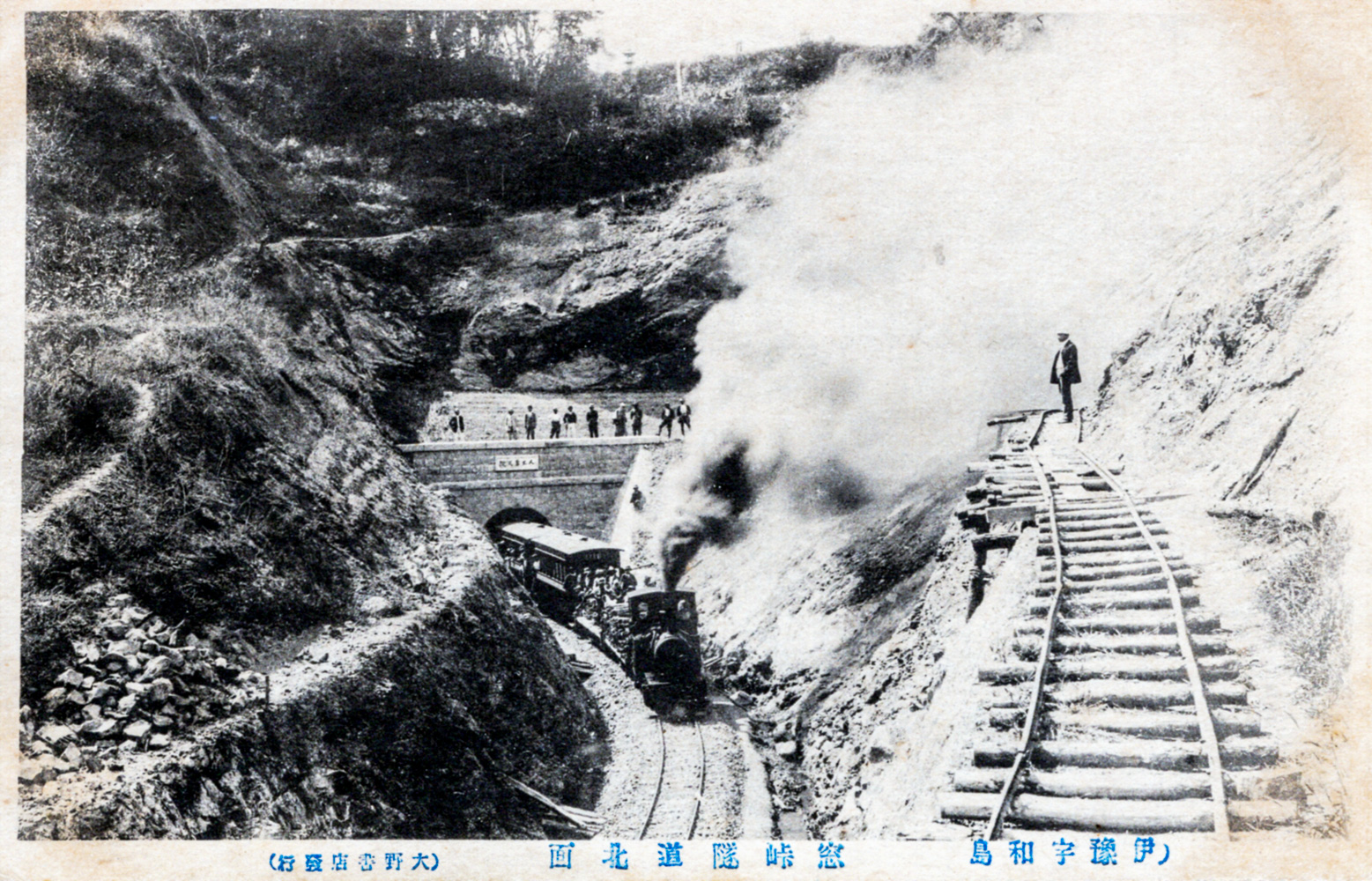 1911(明治44)年に設立された宇和島軽便鉄道もそのひとつで、軌間762mmの狭軌を用いた。同社は1912(大正元)年に宇和島鉄道と改称の後、1914(大正3)年に宇和島~近永間を開業させ、さらに1923(大正12)年には近永~吉野(現在の吉野生)間が開業した。「窓峠隧道北面」と題した絵葉書には、窓峠(まどのとう)トンネルの周囲に大勢の人々が集まり、眼下を通過する列車を見守っている。右側には工事用とおぼしきトロッコの線路が写り、法面(のりめん)も素地(そじ)のままなので、トンネルが完成して軌道の敷設が終わり、試運転を行っている際の写真と推察される。また、トンネルのパラペット(胸壁)には、「人工奪天険」と刻まれた扁額(へんがく)が掲げられ、最大の難所を克服した喜びが記された。