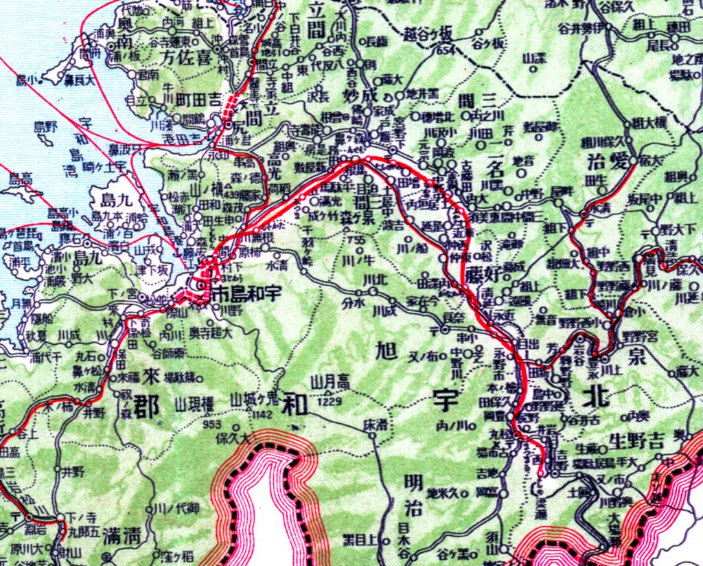 宇和島鉄道は、鉄道省による予讃線の建設が進むとともに、1933(昭和8)年に国有化され、宇和島線となった。国鉄買収後も施設や車両は軽便鉄道のまま使用され続けたが、北宇和島~卯之町間が予讃線として開業すると、旧宇和島鉄道の区間も762mm→1067mmに改軌され、同時に一部の区間を新線に切り替えて、窓峠トンネルも廃止された。