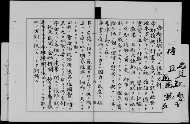 幕末維新期の急激な人口減少、関東大震災・東京大空襲による壊滅的な被害によって、何度か存亡の危機に陥った東京も、そのたびに復興し、現在の繁栄を築いてきた。京都と異なり、都市再生にあたって国が広く関与した東京では、各事業に近代化を先導した国の指導者たちの技術と理念を見て取ることができる。ここでは、明治初期の混乱と、それから半世紀後に近代都市の姿を整えつつあった東京を直撃した関東大震災後の復興の様子を見ていきたい。(北河)
