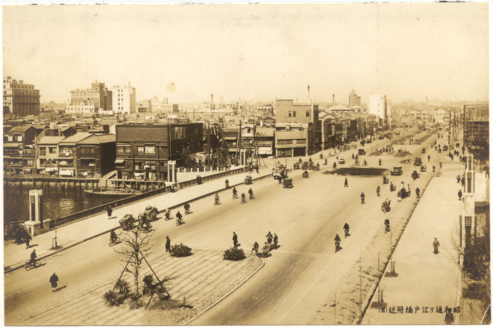After the Great Kanto Earthquake in 1923, most of the reconstruction budget was spent on the road project. The most important of them were trunk line no.1, Showa-dori street, and no. 2, Taisho-dori street (current Yasukuni-dori Street). If Showa-dori street is the north-south axis connecting the north terminal (Ueno station) and south terminal (Shimbashi station) at that time, Taisho-dori street is an east-west axis parallel to JR Sobu line passing through national stadium of Sumo and reaching Chiba.